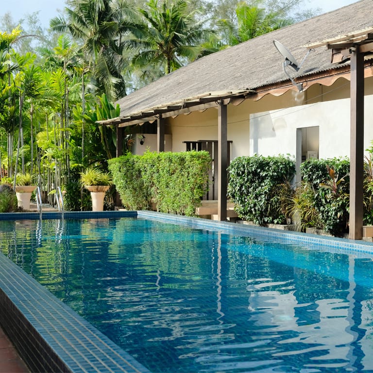 Unwind by our tropical-style pool — perfect for sunbathing, cooling off, or lazy afternoons under the trees.